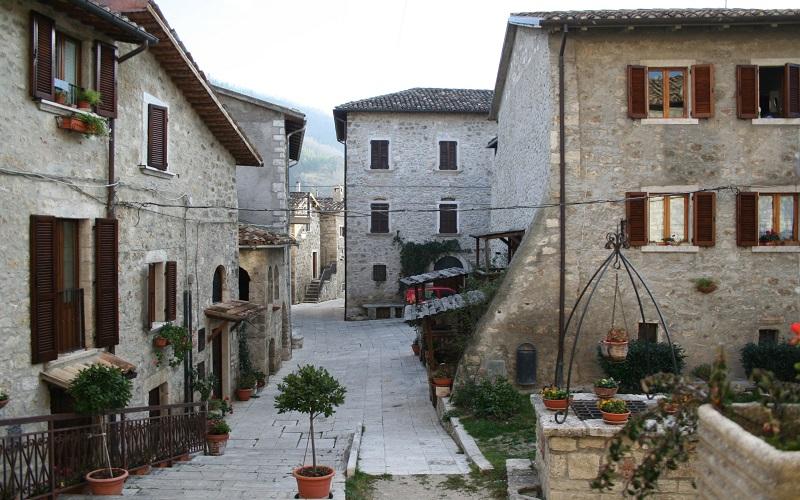 from Ascoli Piceno, jutting out of a cliff of travertine. It was an ancient Longobard fortress, and in the 19th century an extensive necropolis